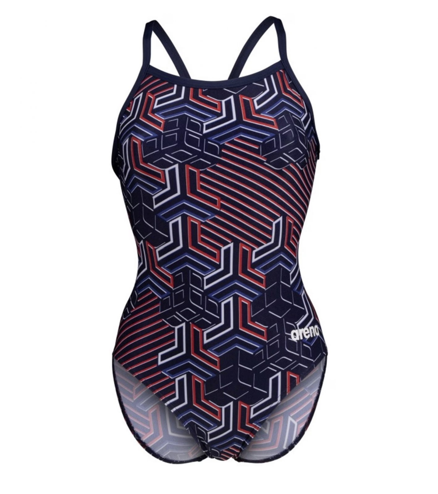 Pregătește-te pentru performanță și stil cu acest costum de baie întreg pentru femei de la Arena, ideal pentru antrenamente intense sau înot recreativ. Cu un design geometric modern în nuanțe de albastru, roșu și alb, acest costum asigură atât un look sportiv, cât și confort optim în apă.